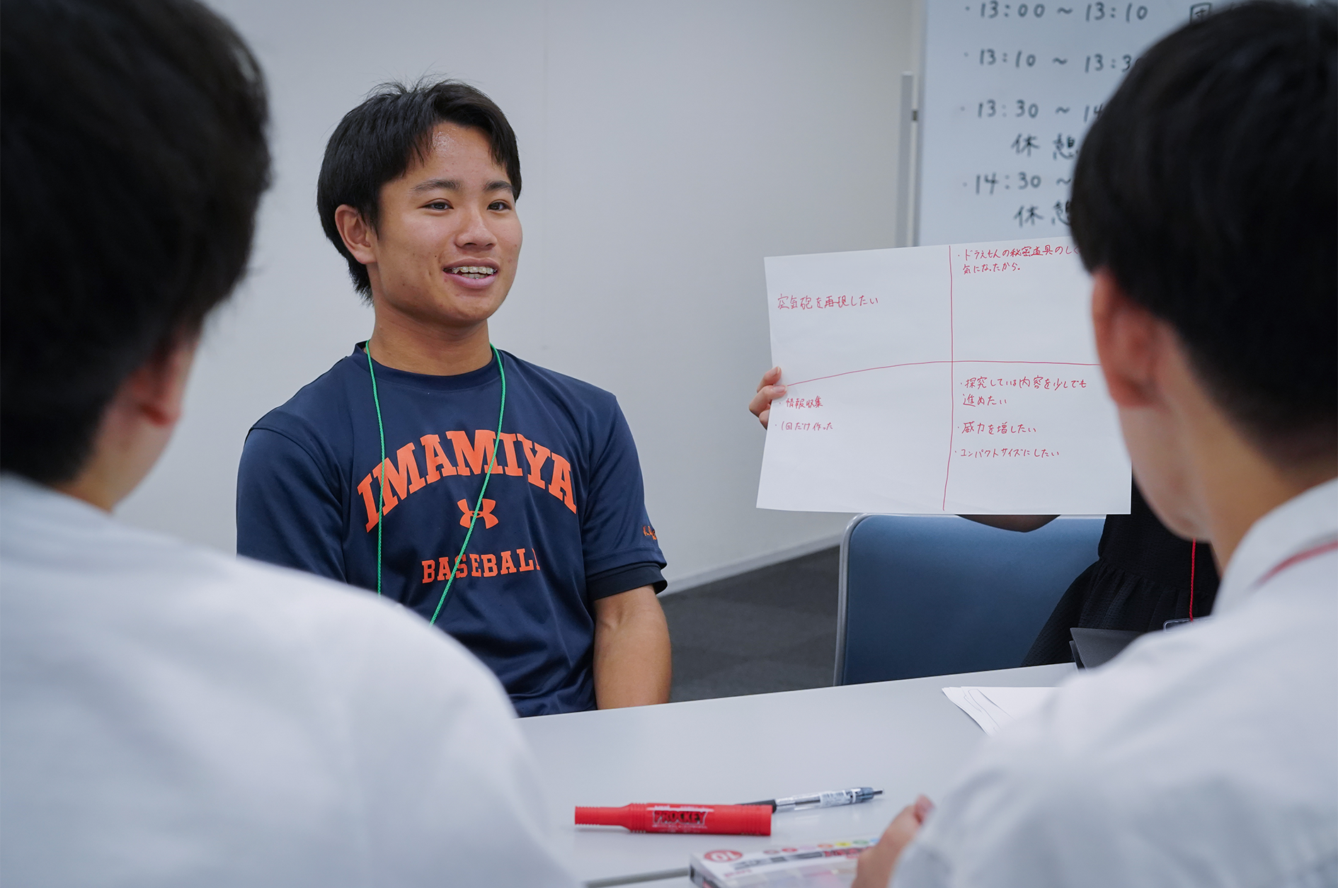 後半は、ペアに分かれ大学生・社会人スタッフとの対話を通じて、自らの探究活動の目的や意義を再確認するワークを行いました。また、他校の高校生とスタッフからなるグループにて、アクションカードを用いながら活動の次のアクションを考えるアクティビティを行いました。
